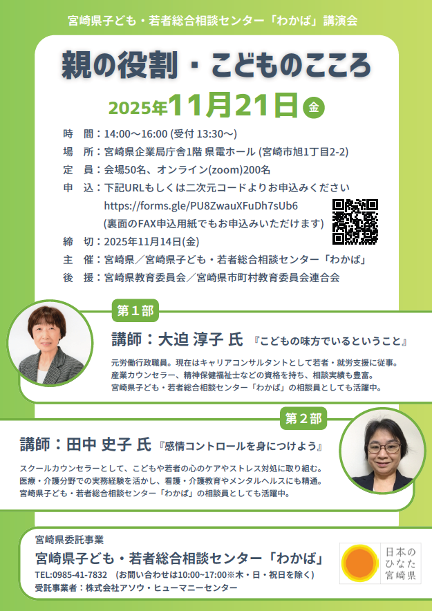 宮崎県子ども・若者総合相談センター「わかば」講演会開催のお知らせ